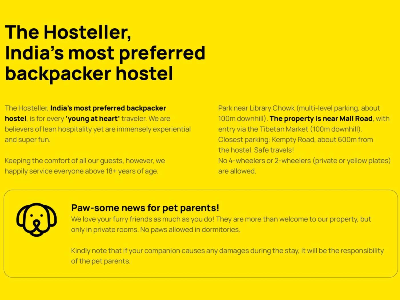 Park near Library Chowk (multi-level parking, about 200m from Library Chowk towards Kempty Road). The property is near Mall Road, with entry via the Tibetan Market (100m downhill). Closest parking: Kempty Road, about 750m from the hostel. Safe travels! No 4-wheelers or 2-wheelers (private or yellow plates) are allowed on Mall Road. In order to keep our accommodation costs as affordable as possible forguests, we have adopted a pay-as-you-go system for certain amenities, such as locks, bath kits, and towels. By offering these items on a chargeable basis, we can maintain lower base prices for our rooms, making our hostel accessible to budget-conscious travellers. We understand that different travellers have different preferences and requirements, so we aim to provide flexibility in our offerings. We cannot guarantee accommodation in the same dorm room. Allocation of a room in a specific private room category may vary depending on availability until the time of check-in. Right to admission is reserved. The Hostellers Unbox cafe is vegetarian and we promote self service only. 9 AM - 2 PM and 6 PM - 11 PM. Café timings may vary. Please refer to the Glu app for more details. Any form of misconduct towards fellow travellers, whether male or female, will result in immediate check-out. This includes verbal abuse, harassment, physical intimidation, or any inappropriate behavior that affects the comfort and safety of others.